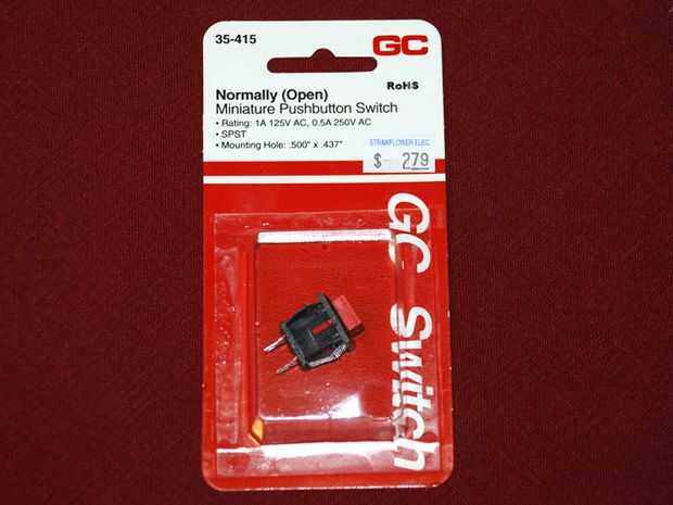 El interruptor es un interruptor "Normalmente abierto" que significa que el circuito es completo y la luz está encendida sólo cuando el botón es empujado y presionado. Tan pronto como se suelta el botón, el circuito se rompe y sale la luz. De lo contrario, escogí este interruptor para su tamaño y forma, no por nada de eso es otras características eléctricas.