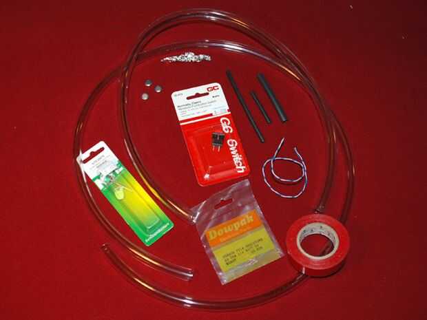 LED, interruptor, resistencias, del encogimiento del calor y cinta de electricista, comprado en tienda de electrónica local.