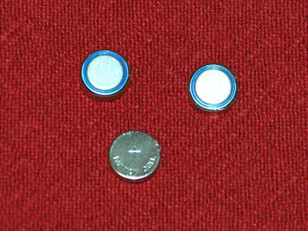 Encontré estas pilas de botón de 1,5 voltios pequeña dentro de una pila A23 (véase la segunda imagen). Tres de ellos trabajan muy bien. Ver esto [ 12 voltios Batería Hack Instructable] para más sobre eso.
