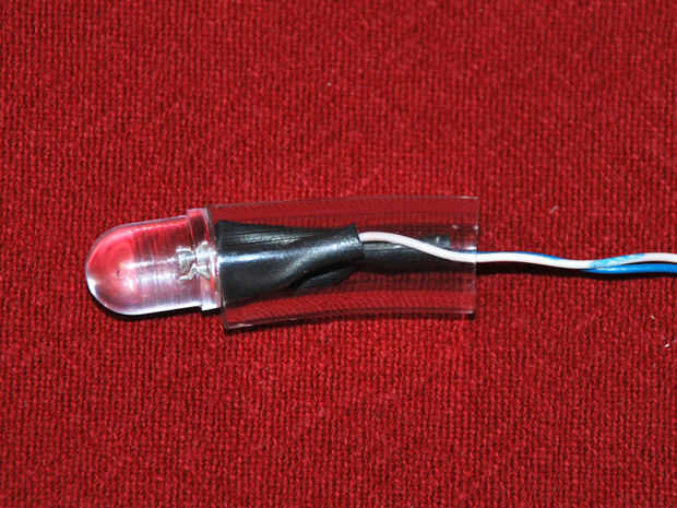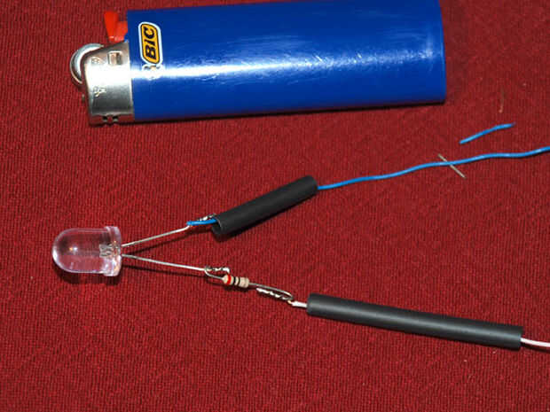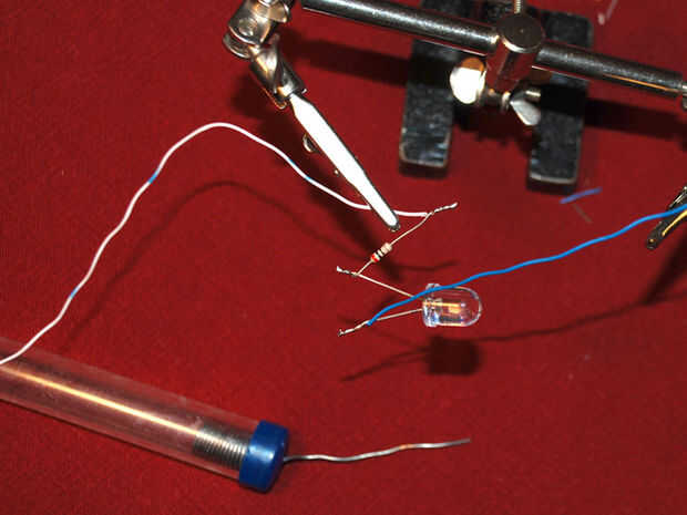 Soldar el LED, la resistencia y los cables en serie. Recuerde que la resistencia puede colocarse en cualquier lugar en el circuito.