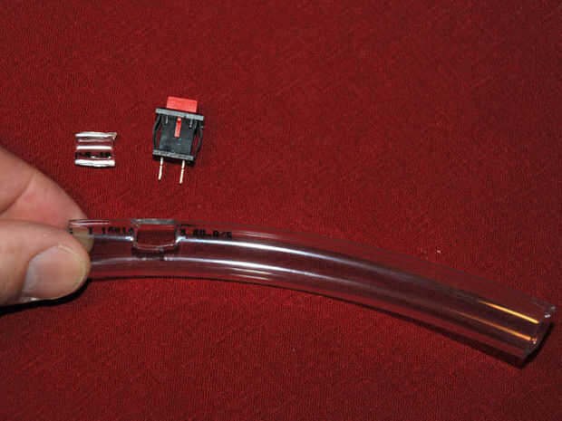 Cortar una longitud apropiada de la tubería de 5/8" OD y cortar un agujero cerca de uno de los extremos para dar cabida al interruptor. Tenga en cuenta cómo encajará la pluma en la mano y donde su dedo se acostará accionar el botón. Ya que tenemos esta luz como una pluma, colocar el interruptor donde nosotros fácilmente podemos empujarlo con el dedo índice.