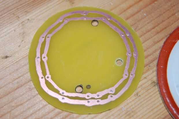 2. utilizando un lápiz etch resist (o en mi caso, una botella de esmalte de uñas mi esposa no quería ya) dibujar dos círculos concéntricos alrededor del borde exterior del tablero de PC. Asegúrese de que hay suficiente espacio en el centro para montar el soporte de la batería!
