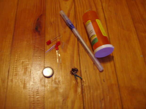 3 LEDS (mismo color), pluma bic, botella de píldora, batería de 9v (no en foto), clip de 9v, interruptor poco, resistencia de 1 k