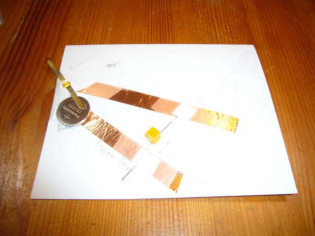 Ahora necesita un interruptor para completar el circuito. La versión más simple es un interruptor de presión, simplemente asegurar el desecho de cinta de cobre utiliza en el paso 3 para probar el LED. Generalmente el extremo tocando la tira de cinta de cobre de la cinta y deje el extremo sobre la batería flojos. Esto funciona para las tarjetas que darán a alguien en persona, pero ya que esto fácilmente se dispara puede ejecutar rápidamente la batería si la tarjeta se coloca en una envoltura.