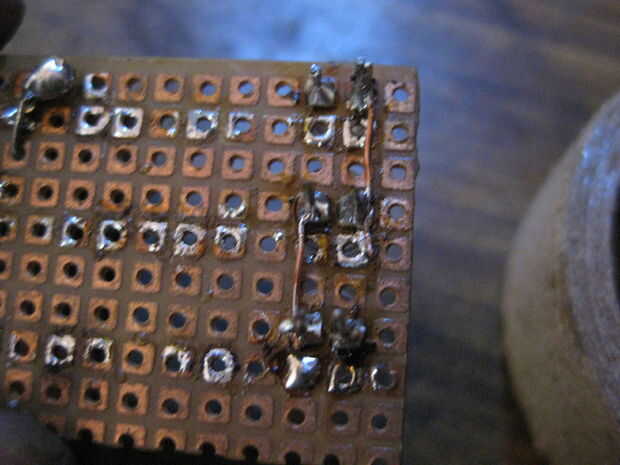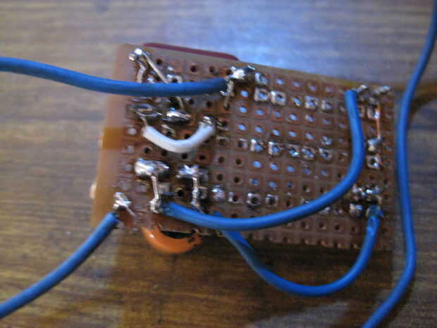 paso uno:Diagrama de la célula Solar y la soldadura de las piezas requeridas en la célula solar. (Foto 2)Soldar dos cables a la célula solar en las conexiones para el motor. Uno para positivo, uno para el negativo. Estas se utilizarán para la luz LED
