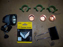 En la foto estos son algunos de los elementos de hardware básico necesarios para este proyecto. La izquierda es una luz de un sistema de VistaLite (ca. 2000) de que el montaje del manillar se salvarse del halógeno 5W. En la parte superior son motor de helicóptero de radio controlada o disipadores de calor motor tamaño "280". Los otros artículos siguen el objetivo de la utilización de materiales fácilmente disponibles: tapas de fontanería de cobre de 3/4", 1" esquina de planchas y un clip de carpeta largo 2". Consulte el paso #3 para una lista de piezas.