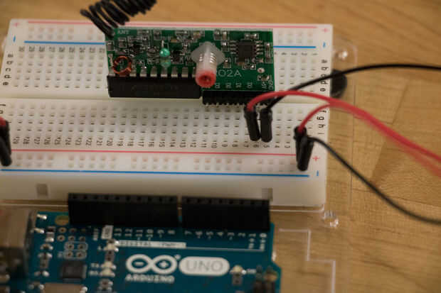 Un cable de puente desde el "-" pista (tierra) de tu placa con el conector "GND" (tierra) del receptor RF. Ejecutar un cable de puente de la pista "+" de tu protoboard a la "+ 5V" pin (energía) del receptor RF.
