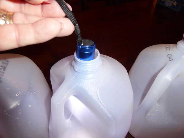 Soltar cuidadosamente su pequeña linterna en la parte superior de la jarra. Luz primero. Que al final de la caída del cordón hacia fuera y vuelva a colocar la tapa en firmemente bastante para sostener la linterna en su lugar. Eso es, excepto decidir dónde vas a usarlas. Sorprenderá la cantidad de luz que pusieron hacia fuera.