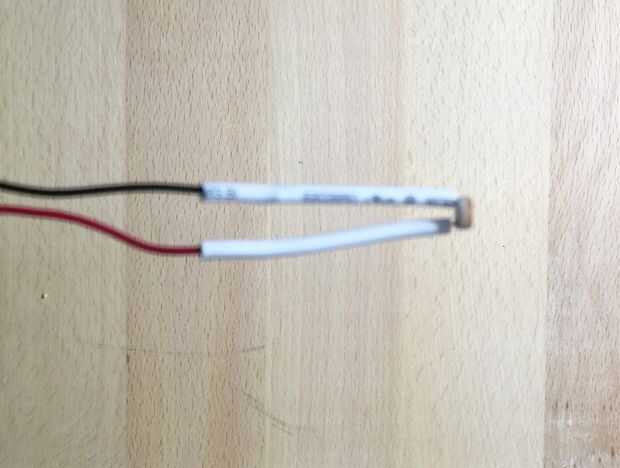 Soldar un cable a cada una de las patas de la LDR para extenderlo por el agujero que perforó en el paso 1.
