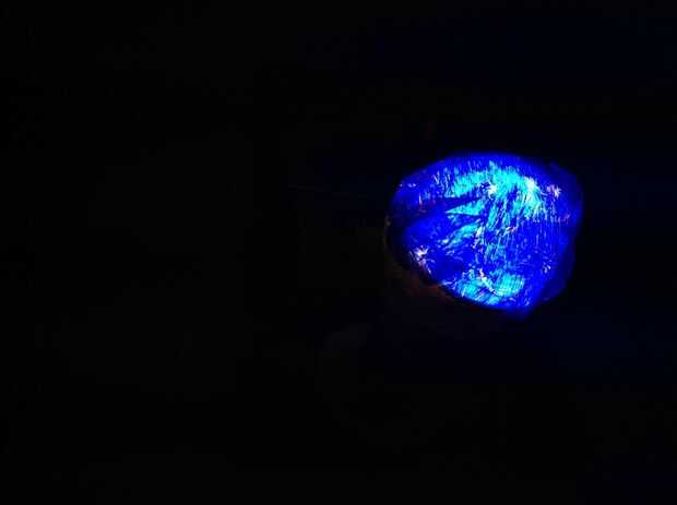 Necesitamos 2 colores azul y un color rojo. Envuelva el papel (dos azules en la parte superior y rojo en la parte inferior) y poner una banda elástica (goma). introducir la bombilla en la toma de corriente y enciéndalo en una habitación oscura.