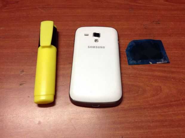 Apague el teléfono en un Hack de luz negra. Su super fácil de hacer!Todo lo que necesita es un smartphone con una luz, tres pedazos de cinta pequeña y dos sharpies. Una azul, una morada.Tomar la primera pieza de la cinta, poner encima la cámara flash