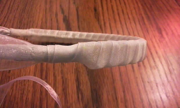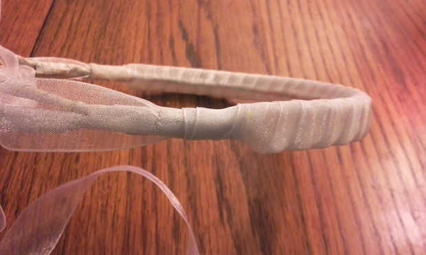 - Tire de los extremos de la cola de la cinta de 40" a través de los lazos en la parte posterior de la diadema.