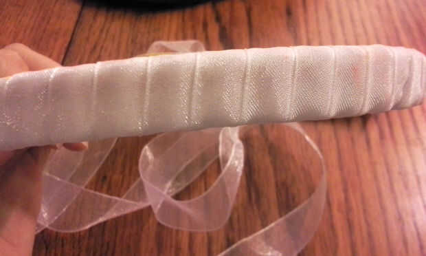 - Corte una 40" pedazo y uno 60" pedazo de cinta opalescente transparente blanca.