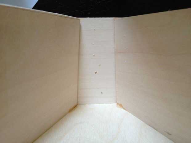 Luego pegué la pieza de abajo a los lados y la cara. La pieza inferior sobresale por debajo de la placa en el frente 1/3 de pulgada. Ten en mente esto es una pajarera, no un pedazo de muebles, no tiene que ser perfecto, y es relativamente fácil de corregir nada.