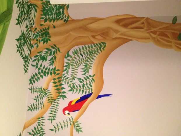 Éste es el árbol pintado en la pared del cuarto de niños. En retrospectiva, el árbol era más tropical que la pajarera, pero terminaron por verse bien juntos.