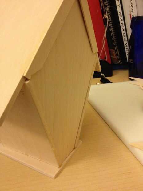 Cortar el laminado madera en pedazos de la misma cosa y había hecho un labio de madera que la placa trasera se abraza contra. Luego colocar la pajarera en un pedazo de madera laminado muy fino y dibujó el contorno exacto de la placa trasera (pegarse un lápiz por el agujero de la puerta). Yo utiliza tijeras (la madera era muy delgada) para recortar la placa trasera. Nota: recortar el techo de este lado también. Lo hice porque la placa trasera permanece en su lugar entre el labio y la moldura. No quiero pegar la pieza posterior porque usted necesita el acceso a las luces para cambiar las baterías, etc..