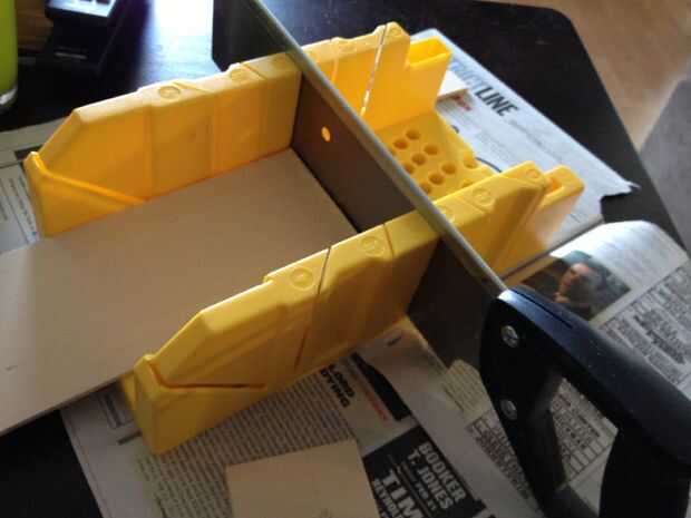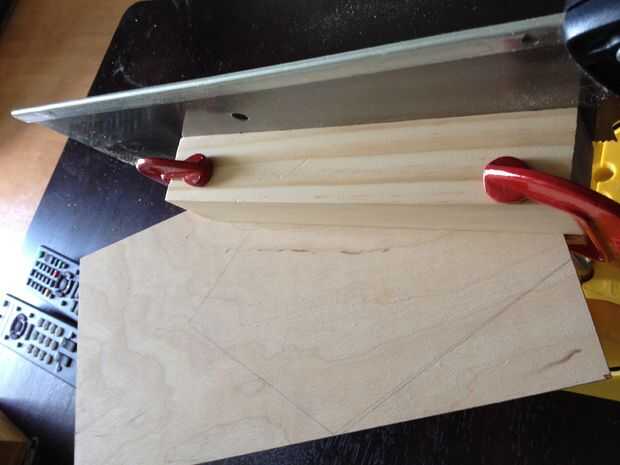Utilizo una caja de ingletes para cortar los lados, pedazos de techo y la parte inferior. Es una manera simple de hacer cortes rectos. Sin embargo, la cara y la espalda eran demasiado grandes para cortar en la caja de ingletes. Para cortar la cara, he usado madera de desecho y las abrazaderas en el corte y aserrado a lo largo de la madera. No cortar la placa trasera todavía.