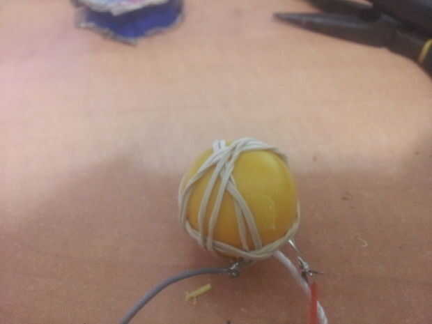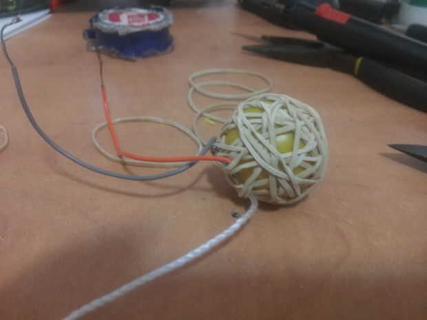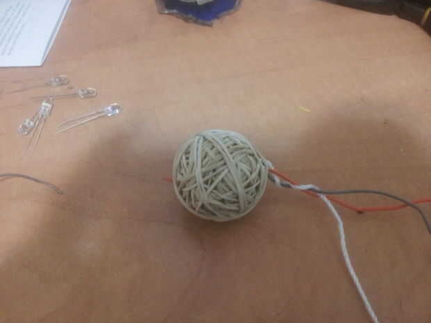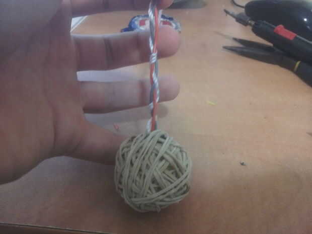 Comenzar a envolver la bola con bandas de goma hasta que apenas pueda ver el balón (Asegúrese de que todos los cables están en el mismo lado).