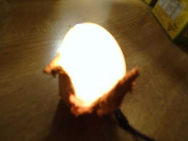 He utilizado parte de una caja de huevo y tenía mi huevo ligeramente inclinada a un lado así el cable y bombilla podría caber a través de.