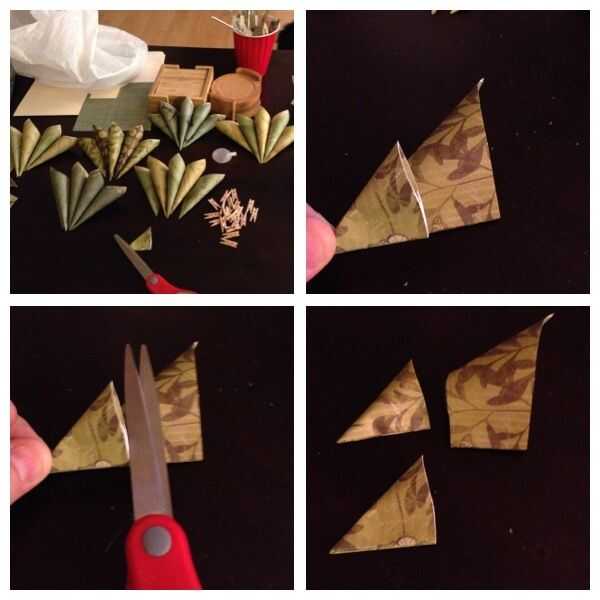 Después de que el pegamento seque corté un pétalo alrededor de una pulgada de la parte superior. Solía el fondo desechado del pétalo como calibre de corte los otros cuatro pétalos por flor. Una vez que fueron cortados los pétalos, "había mullida" a los lados y dispuestas en forma de flor.