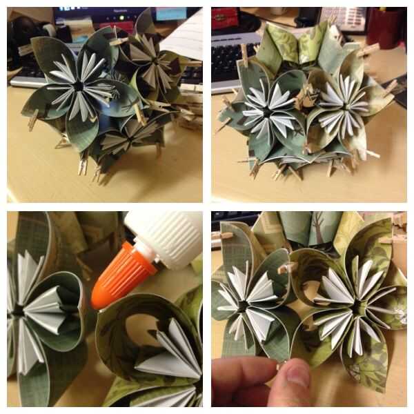 Luego tomó las restantes 11 flores y comenzó a construir la bola de la flor. Primero encargué 5 de ellos en un círculo, manteniéndolos junto a punta de arte ropa pines pétalo a la punta del pétalo. Una vez montado, me sacó unos alfileres de ropa a la vez y pegados entre ellos. Yo entonces les atractivas. Una vez que el círculo entero fue terminado y pegado, comencé el siguiente anillo en la bola pero fijando el siguiente nivel de flores en el círculo.