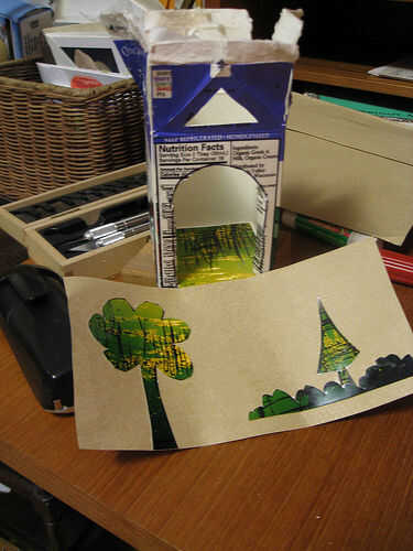 Se trata de una luz nocturna que construí utilizando una caja de cereales vacía, un pin y un enchufe de lighbulb de una luz de noche vieja.El reciclaje es el proceso de tomar objetos que principalmente se tomarían a un vertedero, y utilizar esos obje