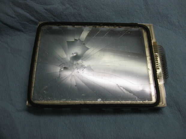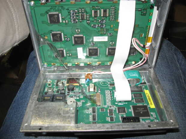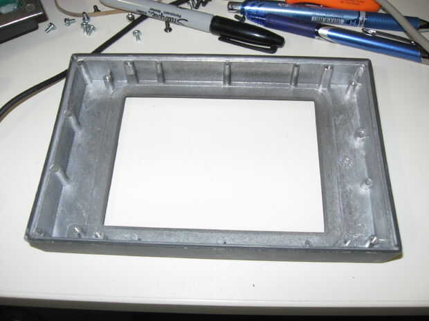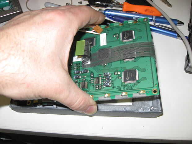 Quite el portador de la LCD. (pieza metálica que sostiene el cristal LCD a la placa de circuito. Es sostenido en lugar por lengüetas de metal dobladas en la parte trasera de la placa de circuito.