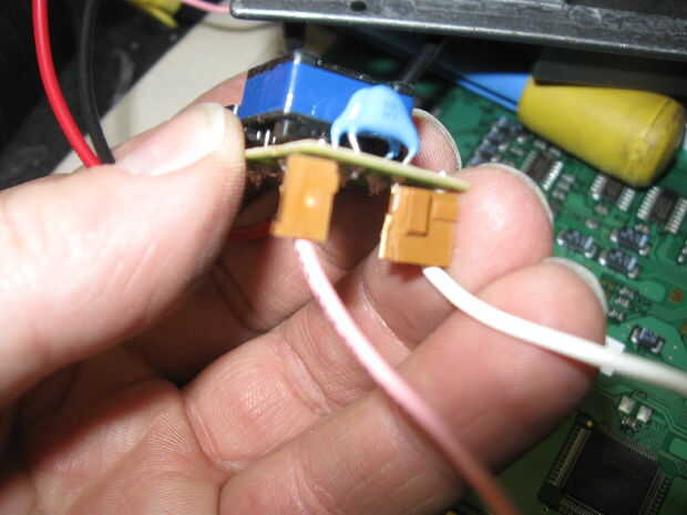 La lámpara lleva proporciona una manera conveniente de conectar al circuito pero el espacio estaba equivocado. Corté el conector por la mitad para separar luego conectado directamente a la placa de circuito.