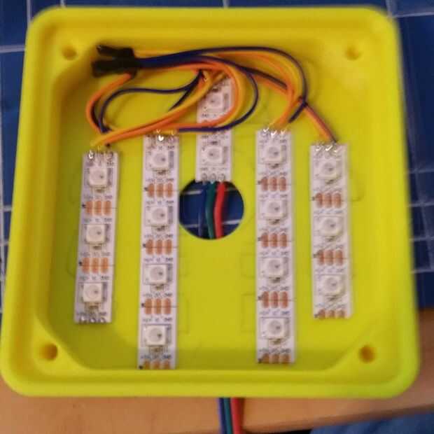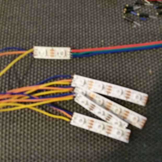 Una vez que estas conectado puede empezar para arriba que las otras tiras, el patrón pueden variar de cableado he levantado mina toda rama de la tira led inicial. Conectando el pin de la de la cabeza llevó a las tiras DI entradas. entonces también conecté la + 5v y GND de la tira luego inicial para todas las tiras. es decir que cableado hecho asegurado cualquier conexión desnuda visible con tubería de encogimiento de calor y después de que el LED en el caso.