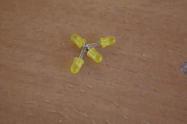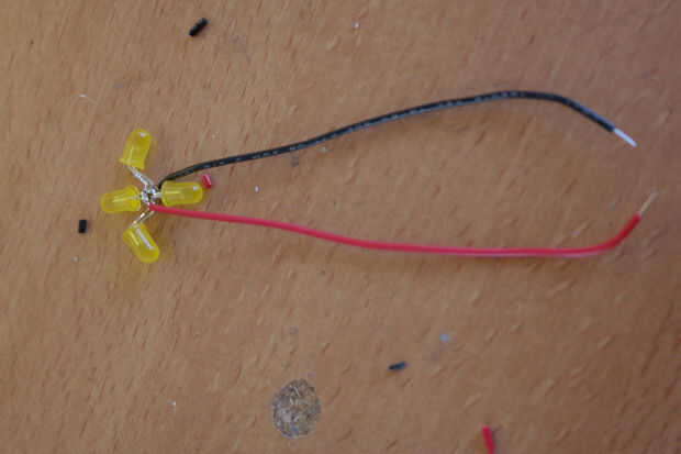 Solde los 4 leds en una estrella. Corte las patas de los leds para que ha dejado unos 8mm, luego soldar los leds, positivo con positivo y negativo a negativo. Cortar las patas de los leds quedan un poco más largos (alrededor de 10mm) y la soldadura en un ligero ángulo para que los anteriores LED. Otra vez, positivo con positivo y negativo con negativo. Puede doblar algunos de los LED para mejorar la iluminación.