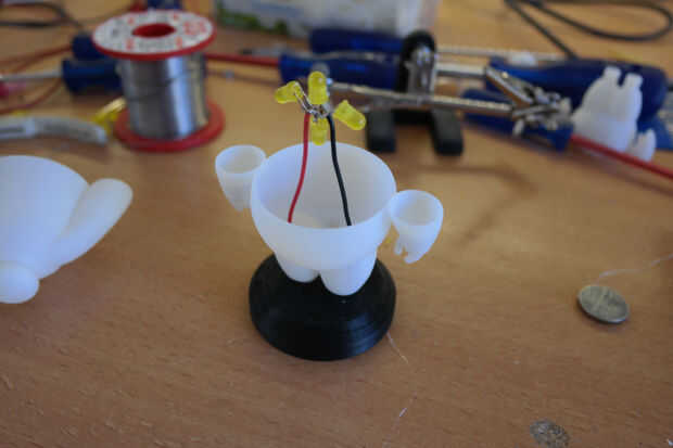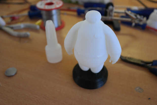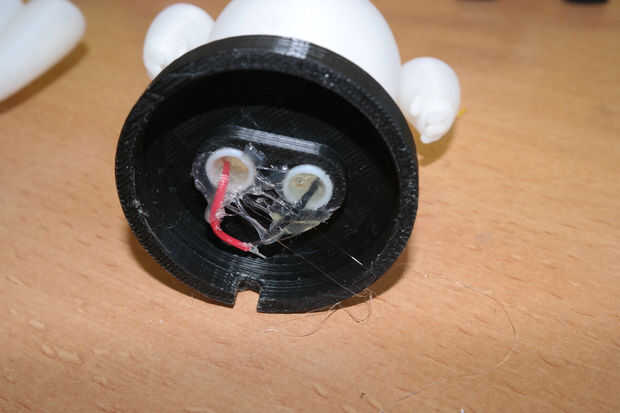 Inserte la parte inferior de baymax en la base, las piernas tienen dificultades accesorio, lijar los agujeros o las piernas. Inserte los cables en las patas y coloque la tapa en averiguar donde los leds tendrán que ser. Doblar los cables en la base para establecer la altura, luego con pegamento caliente, pegar los cables a las patas y las patas a la base.