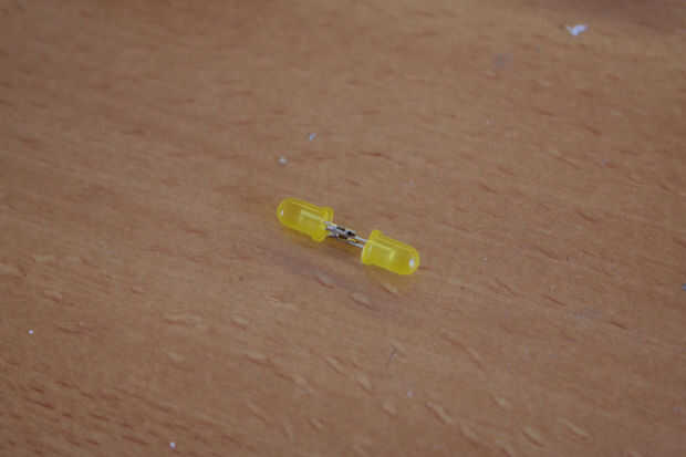 Soldadura de alambres rígidos, alrededor de 15cm de largo a los leds. Uso de red para soldar el lado positivo (la parte redonda del anillo del LED) y negro para la soldadura en el lado negativo del led (la parte plana en el anillo).