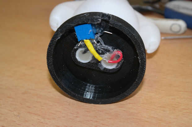 Para el potenciómetro, perfore un pequeño agujero en el lado o la parte inferior, dependiendo del tipo de medidor que está utilizando. Luego pegue el potenciómetro a la base de tal manera que pueden ser ajustado cuando la base está cerrada. Utilice a un encogimiento de calor y resistencia a la brecha desde el cable positivo del led a la patilla central de la medidor.