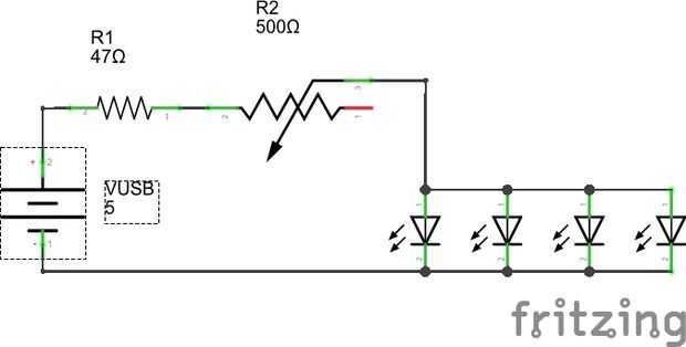 Habrá poca electrónica en la parte inferior, pero los leds requieren un resistor. También he añadido un potenciómetro por lo que podía manejar el brillo en una etapa posterior.