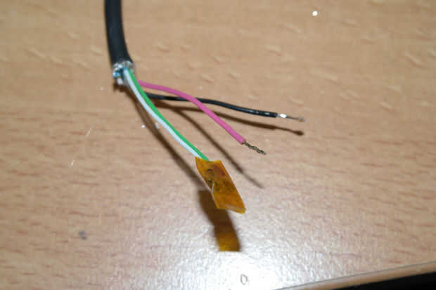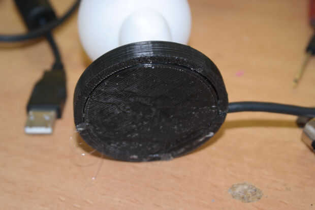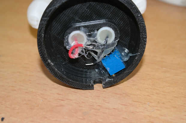 Ahora corte el lado de (conector pequeño) USB mini del cable USB. Luego, con un cuchillo, con cuidado quite 5cm del aislamiento. Los cables verdes y blanco pueden sellarse con cinta o calor shrink, para asegurarse de que no toquen nada. Los cables negro y rojo (+) son los cables que se necesitan. Suelde el cable negro al cable negro del Led y soldar el cable rojo al pin izquierdo o derecho del medidor. Utilice un adaptador USB para probar la luz baymax. Si se enciende, felicitaciones. Ahora pegue todo en su lugar y utilizar la tapa para cerrar la base.