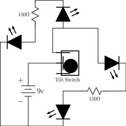 Para este paso nos va ser soldar todos los componentes electrónicos a la Junta de perf. Se presenta el circuito de modo que dos LEDs en serie con una resistencia entre ellos. Hay dos pares de estos LEDs y los pares están conectados en paralelo con sus cátodos conectados al cable negativo de la batería. Los ánodos están conectados a positivo mediante el interruptor de inclinación. En la orientación "Off" del interruptor de inclinación se abre y desconecta la batería y en la orientación de "On" se cierra el interruptor de inclinación, encender los LEDs.