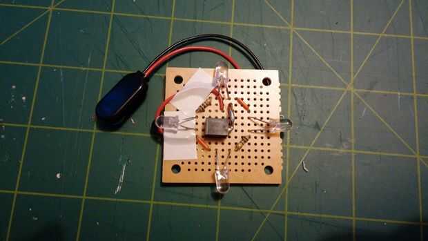Si, como yo, usa un interruptor de inclinación con tres cables y eso probablemente significa que detecta la inclinación en dos direcciones diferentes. Ya que realmente sólo cuidado acerca de cómo cerrar el circuito en una orientación, tendrás que girar de lado al adjuntarlo y luego usar los dos cables principales (porque queremos que el circuito cerrado cuando el tablero está al revés). Para conectar el interruptor, que soldar unos cables cortos para los conductores y les funcionó a través de la Junta de perf para poder soldarlos apropiadamente. Soldar el plomo más superior en el lado del ánodo de los LEDs