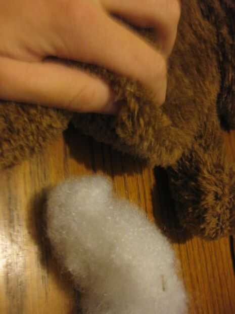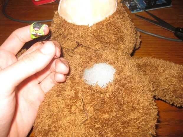 Comenzar su corte a lo largo de la parte del vientre osos y eliminar algunos de los rellenos. Sólo saqué todo lo que necesitaba para trabajar. A continuación, cortar el agujero en el frente de su pecho con un par de tijeras y cosido por los bordes para evitar que viene aparte.