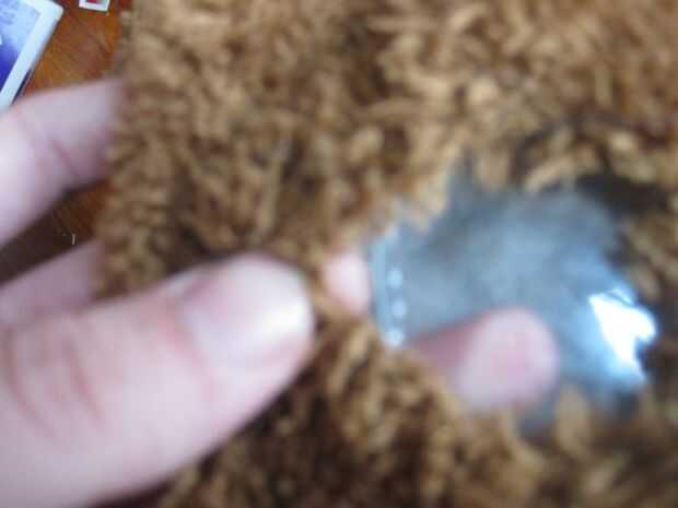 Esta es la parte donde usted añade su pequeña ventana de plástico. He usado la bolsa de un paquete de clip, pero esto es una parte donde usted puede conseguir creativo, tal vez un color diferente o forma. Una vez que corté, tomó un martillo y un clavo y alrededor del borde, perforando pequeños orificios así podían ser cosido en el oso.