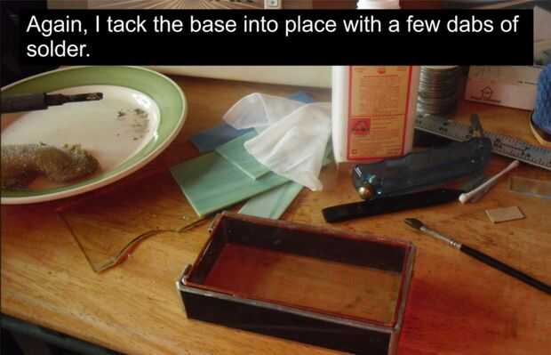 La mejor técnica es soldar entre sí los lados y luego coloque la unidad sobre un pedazo de vidrio luego usar esto como una plantilla para la base cuando se dibuja sobre el vidrio para obtener el tamaño perfecto.