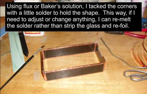 En esta etapa es una buena idea para virar las piezas juntos sólo para asegurarse de que todo encaja sin problemas. Soldar todo junto sin comprobación significa que si es un error, la hoja de cobre tiene que ser pelado apagado el vidrio para corregirlo. Virar las piezas con una pequeña cantidad de soldadura significa errores pueden corregirse derrite la soldadura y reposicionamiento.