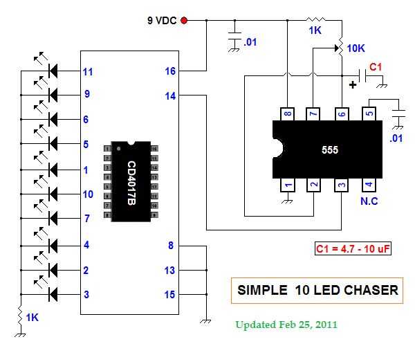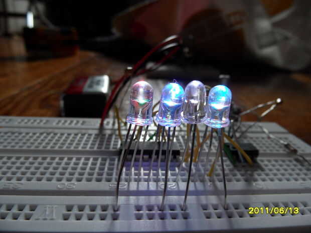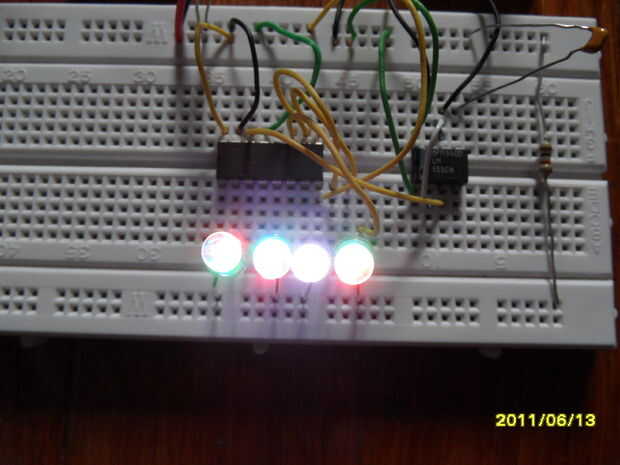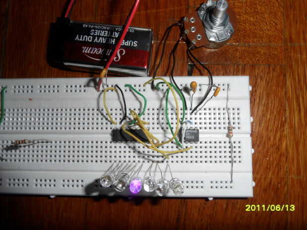 Primero construí este circuito en un protoboard sin soldadura para los valores de las partes podrían cambiar fácilmente. Seguir el esquema. Si quieres probar diferentes LEDs y diferentes órdenes para una secuencia aleatoria.