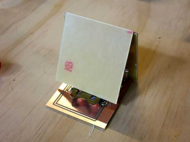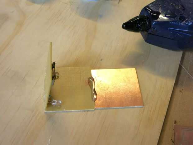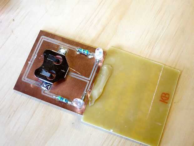 • Una vez más, como el pegamento se refresca, la lamparita de pie sobre su base (la placa de circuito) y doblar el FR-1 a pegado a la parte superior hacia abajo y sobre el portapilas, tal como se muestra en las fotos. El cobre actúa como un reflector para los LEDs.