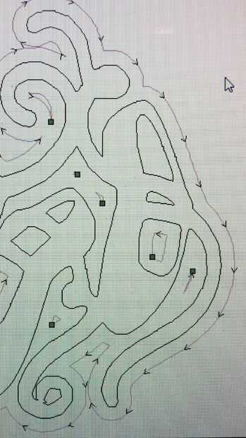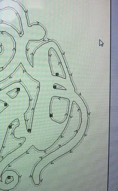 Si quiere lujo al generar las trayectorias de herramienta, puede generar unos archivos diferentes para hacer tu trabajo un poco más rápido. Por ejemplo, puede generar un paso áspero que describe la forma básica que es cortar con una fresa más grande, y luego generar un paso fino que corta los detalles más pequeños con una herramienta más pequeña. Las fotos de arriba muestran lo que parece en el programa que utilizamos para nuestro G-code.