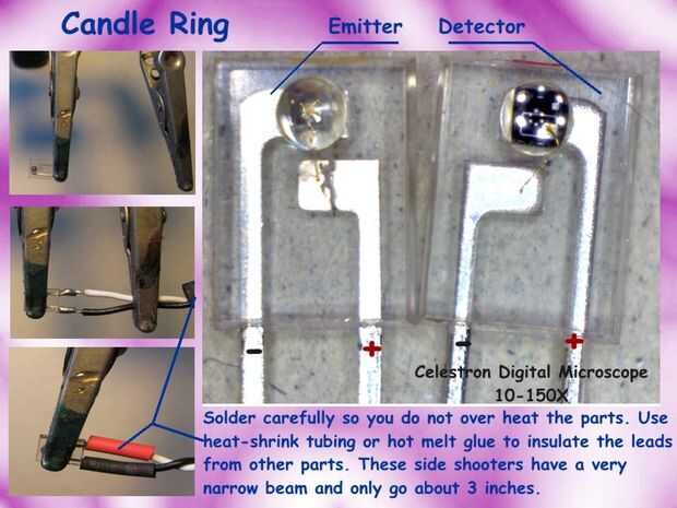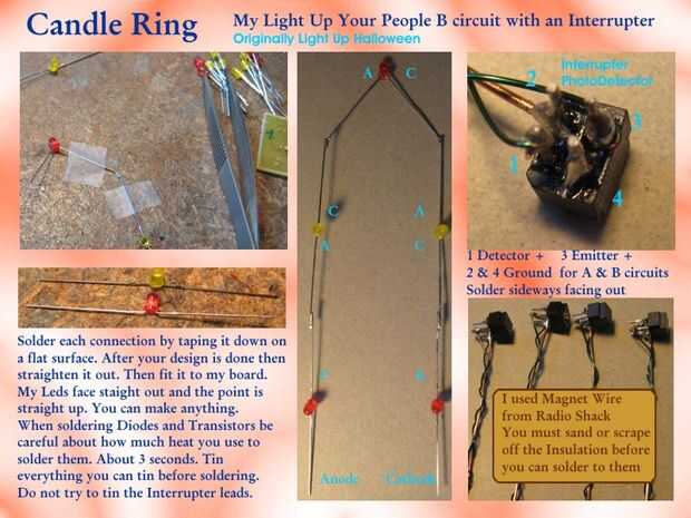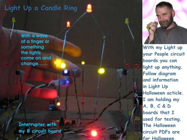 Usando mi tarjeta de circuitos de luz encima de su gente (luz hasta Halloween) B a la luz un anillo de vela o cualquier cosa. En este circuito estoy usando lo que llamo un interruptor. Tiene el detector de infrarrojos y el emisor en un paquete. Éste quede recto hacia arriba y tiene cuatro. Ver las fotos. En este circuito B necesitaba cambiar la forma de R3 de 10K a 33K para manejar el detector del interruptor. Yo no he hecho los circuitos C y D para usar el interruptor aún. También porque el interruptor tiene su propio emisor acabo de poner una resistencia de 220 ohm en la pizarra al lado de R3 a energía. El lado derecho de R3 es V + 9v. Sólo Suelde la resistencia 220 a R3 encima de mi mesa.