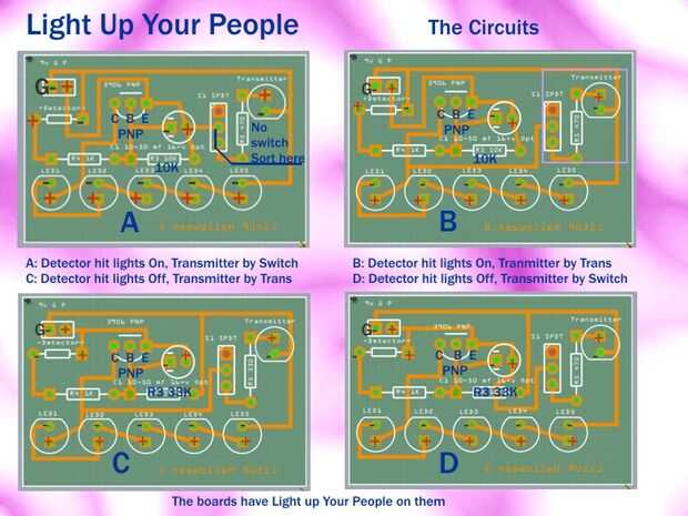 A & circuitos B que la luz se enciende cuando el detector se ilumina por un emisor. C & D apagan las luces cuando el detector se ilumina. A & circuitos D que el conmutador está conectado a + V para encender el emisor. Circuitos B y C, el conmutador está conectado al transistor por lo que el emisor convierte solamente encendido si el detector está encendido. Pueden hacer muchas cosas maravillosas con mis circuitos.