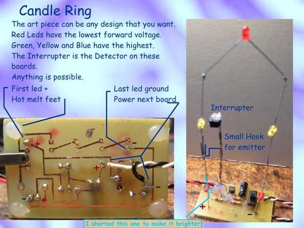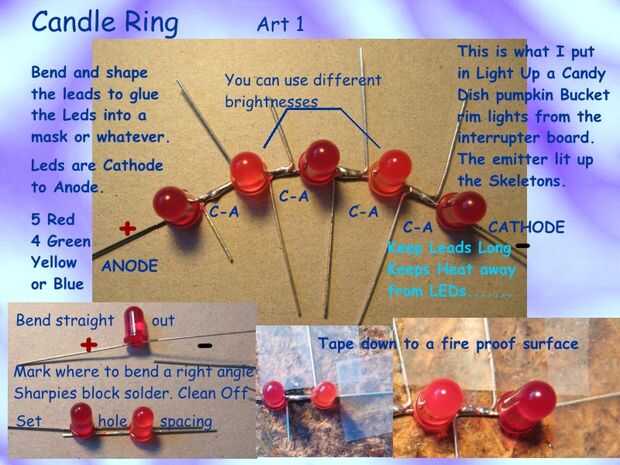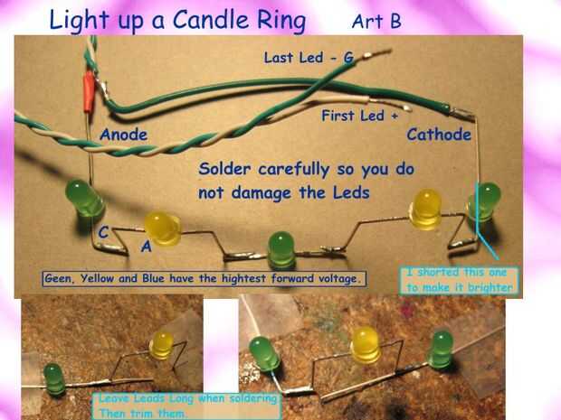 Cada arte vela Led tiene mi circuito del B con un emisor, interruptor y hasta 5 Leds. Detector del interruptor es el detector de estos circuitos. Les hizo ver como una ventana. Se puede hacer nada. Mantenga que el Led lleva mucho tiempo al hacer tu obra de arte. Esto evita que el calor de lo Led. Recortar los hilos según sea necesario después de que les de la soldadura. He pegado a mi escritorio y soldadas a cada articulación. Después de la obra de arte es luego enderécelo y luego ajustarla a mi Junta. Los LED son de serie cátodo al ánodo. El primer ánodo Led va a positivo de Led primera de la Junta. El último cátodo Led va a la última tierra de Led de la Junta.