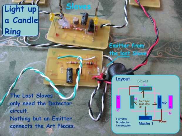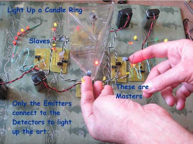 En este proyecto el interruptor de luces de su transmisor y el arte de Led por medio de cables y un gancho enciende el interruptor del arte llevado enfrente de él. Mediante la combinación de otros circuitos puede crear arte de movimiento. Sólo apuntar los emisores en los detectores y mover las luces. Si se trata de la última tabla en un grupo puede dejar hacia fuera el interruptor, el resistor(R5) emisor y el emisor. Emisor de Led de tamaño normal puede iluminar un área grande y muchos de mis circuitos a la vez. El tipo de plomo de lado shooter dos un haz muy estrecho y sólo cerca de tres pulgadas. Apantallamiento infrarrojo callejero es una buena idea, pero callejero infrarrojo también puede ser divertido.