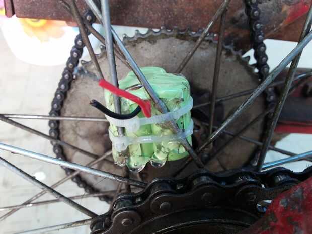 Con la ayuda de pegamento caliente y cable lazos Conecte la batería al cuerpo interno de la rueda para que la rueda gire sin obstáculos de la batería. Fije la batería más inferior que experimenta menos fuerza centrípeta cuando la rueda gira.