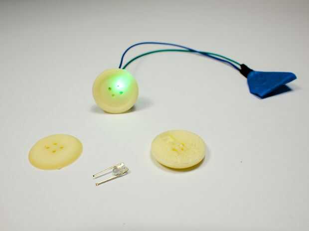 Cada botón tiene 4 agujeros. Esto le permite a coser junto con dos hilos separados. uno para la tierra (-) y uno para el +. Asegúrese de que las roscas no toquen. Esto resultará en un corto, y no habrá ninguna luz. Para mayor conexión, intente colocar el hilo a cada lado de los pequeños pasadores LED dentro de los botones que sólo imprime.